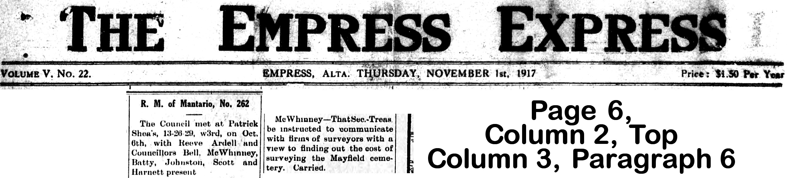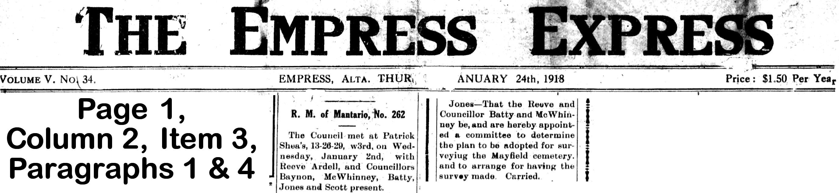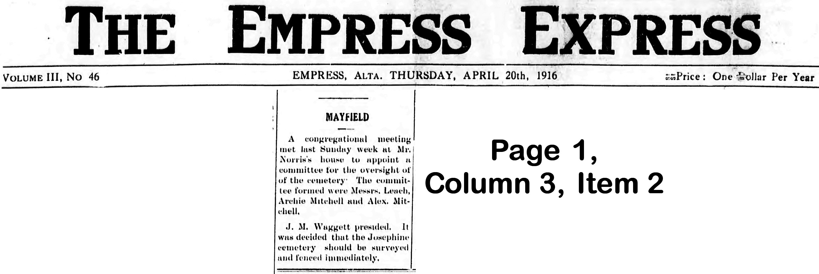 1915-Feb-26: First mention of the Mayfield Cemetery in The Empress Express Newspaper.