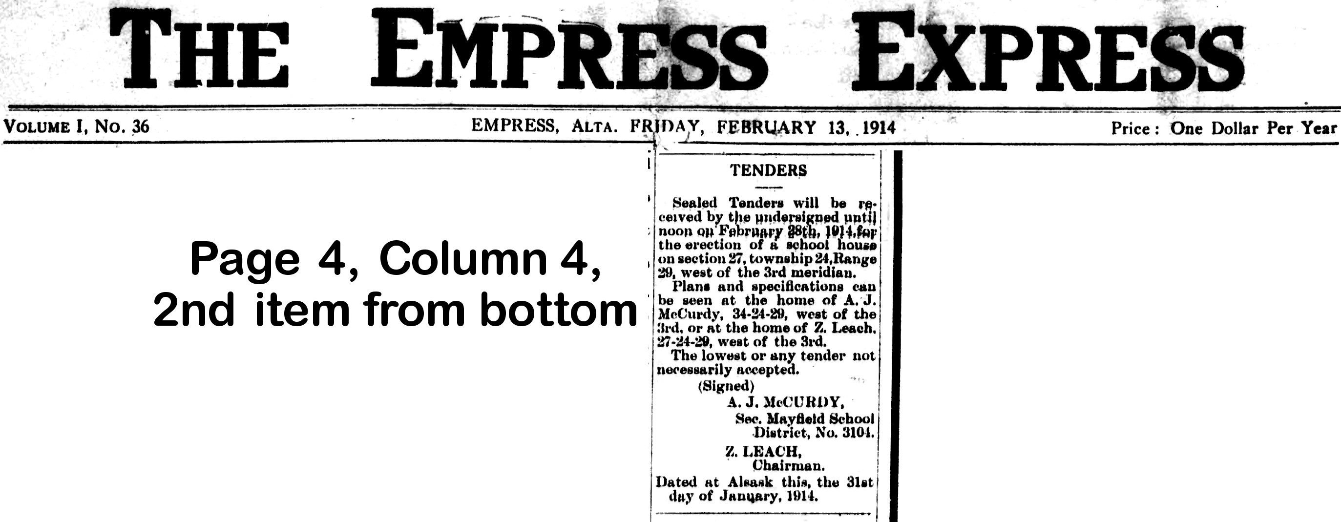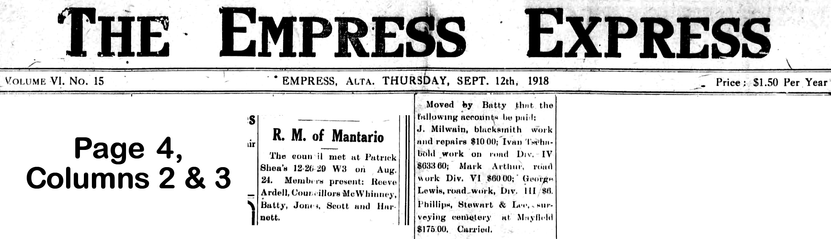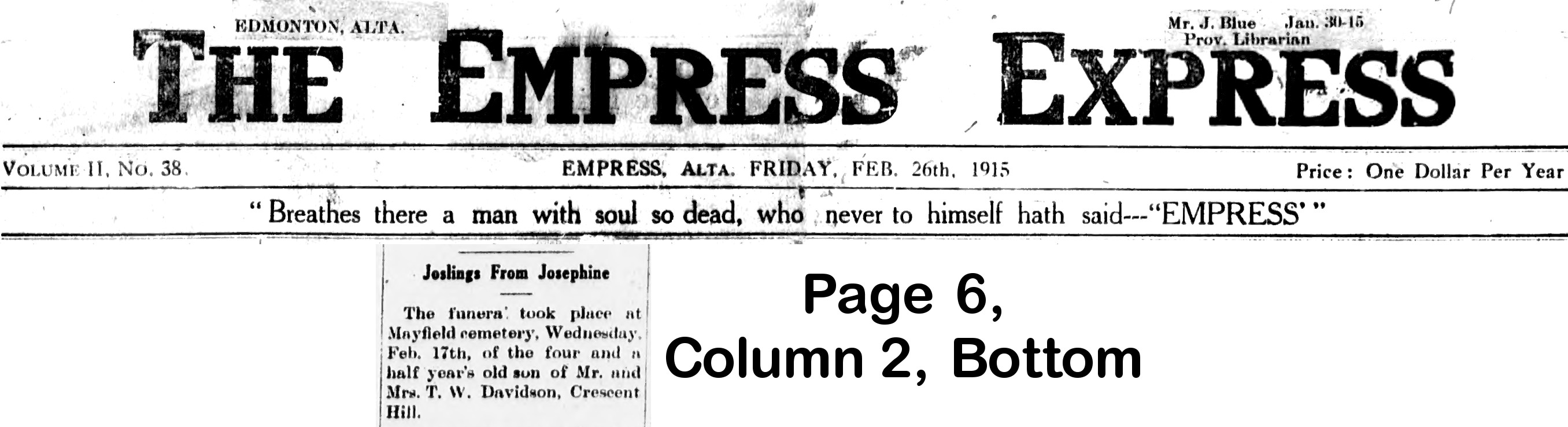 1915-Feb-26: First mention of the Mayfield Cemetery in The Empress Express Newspaper.