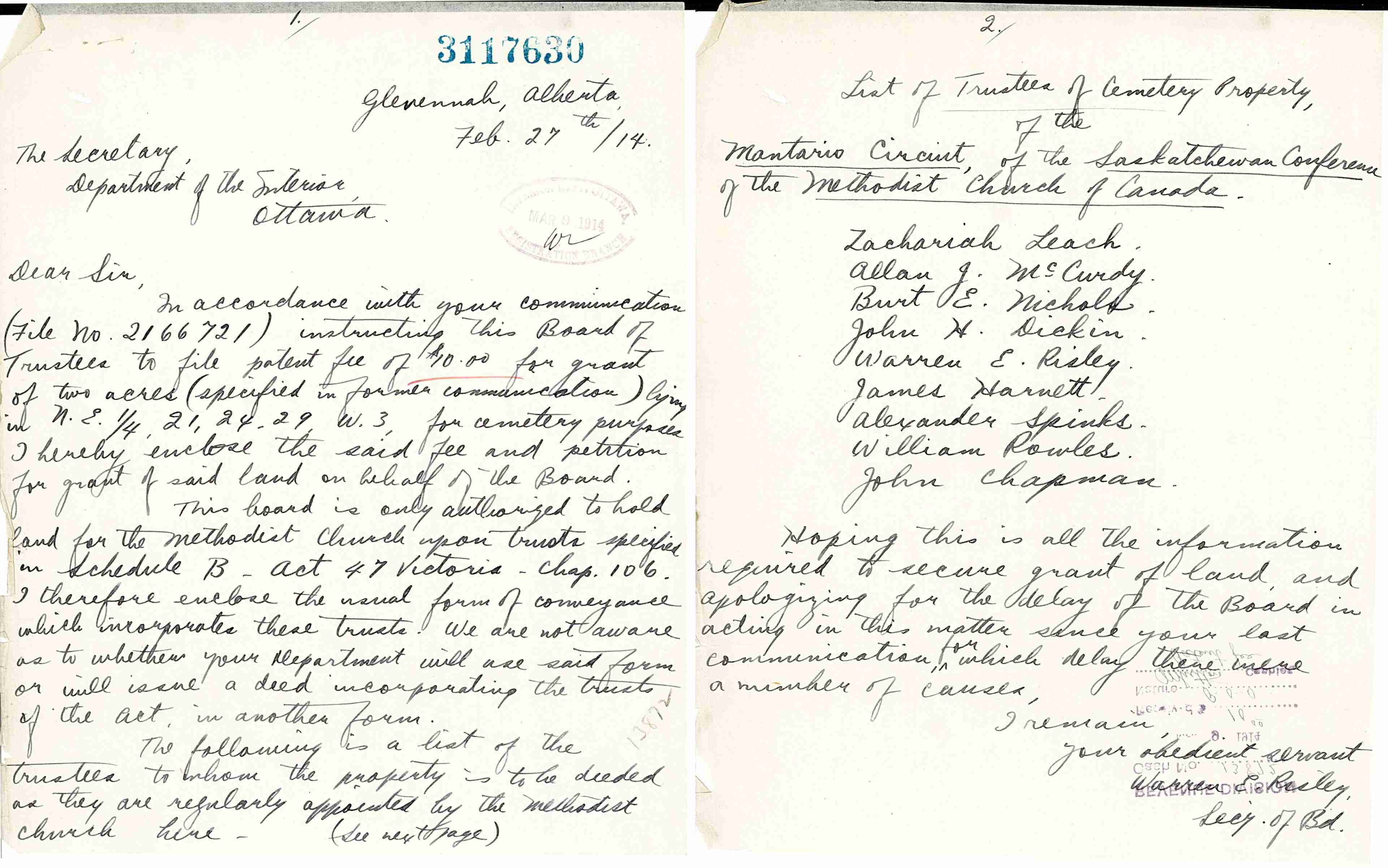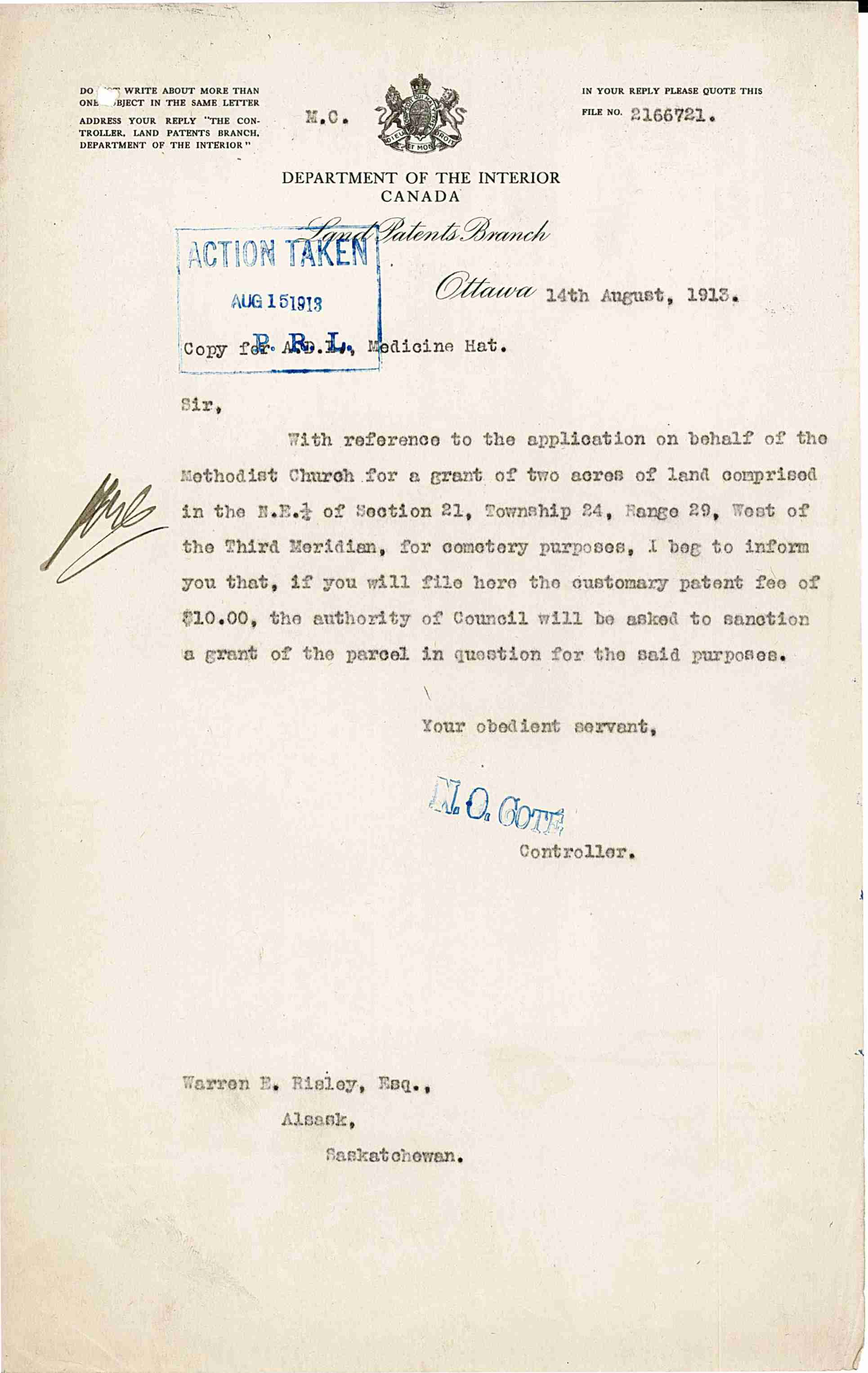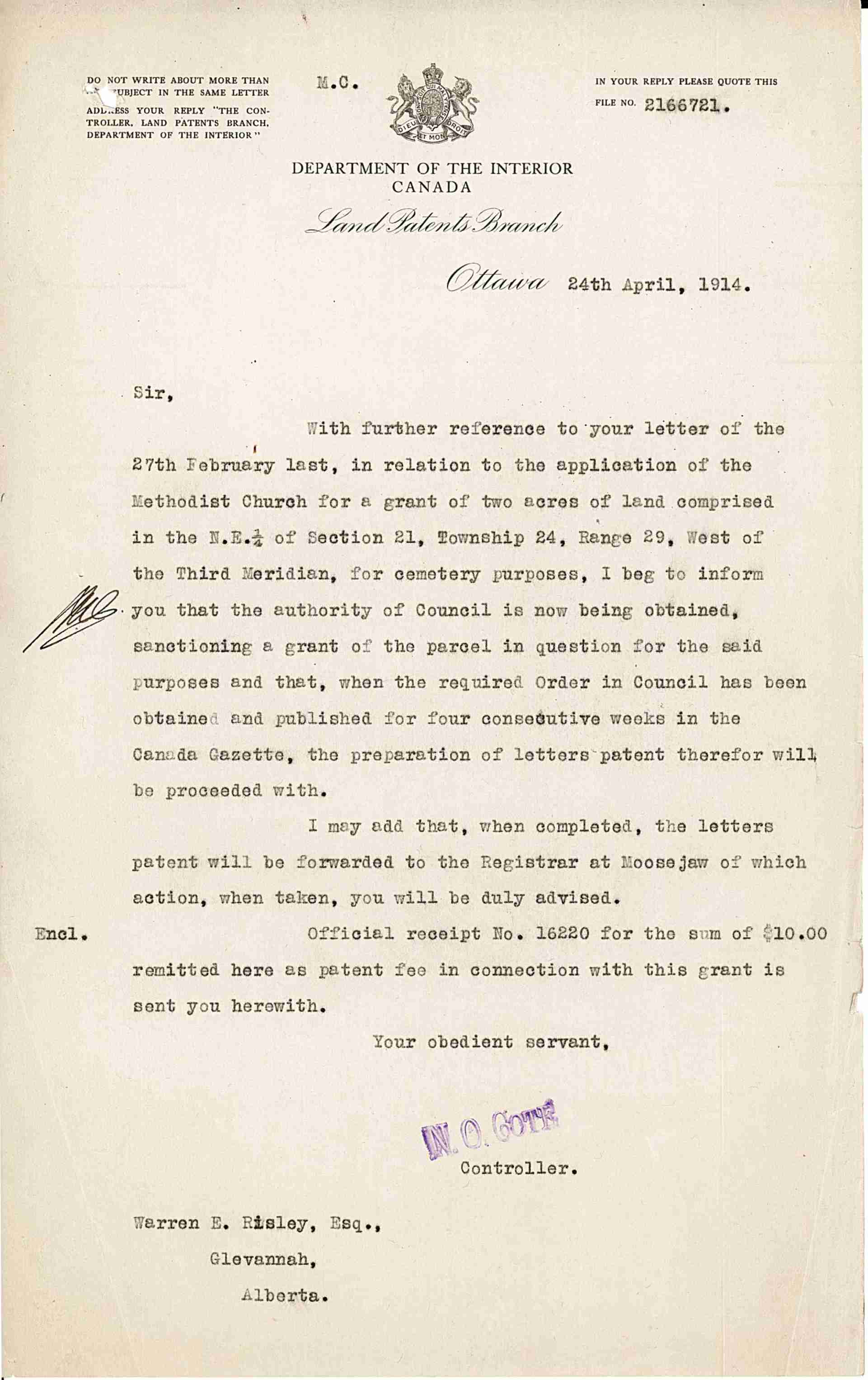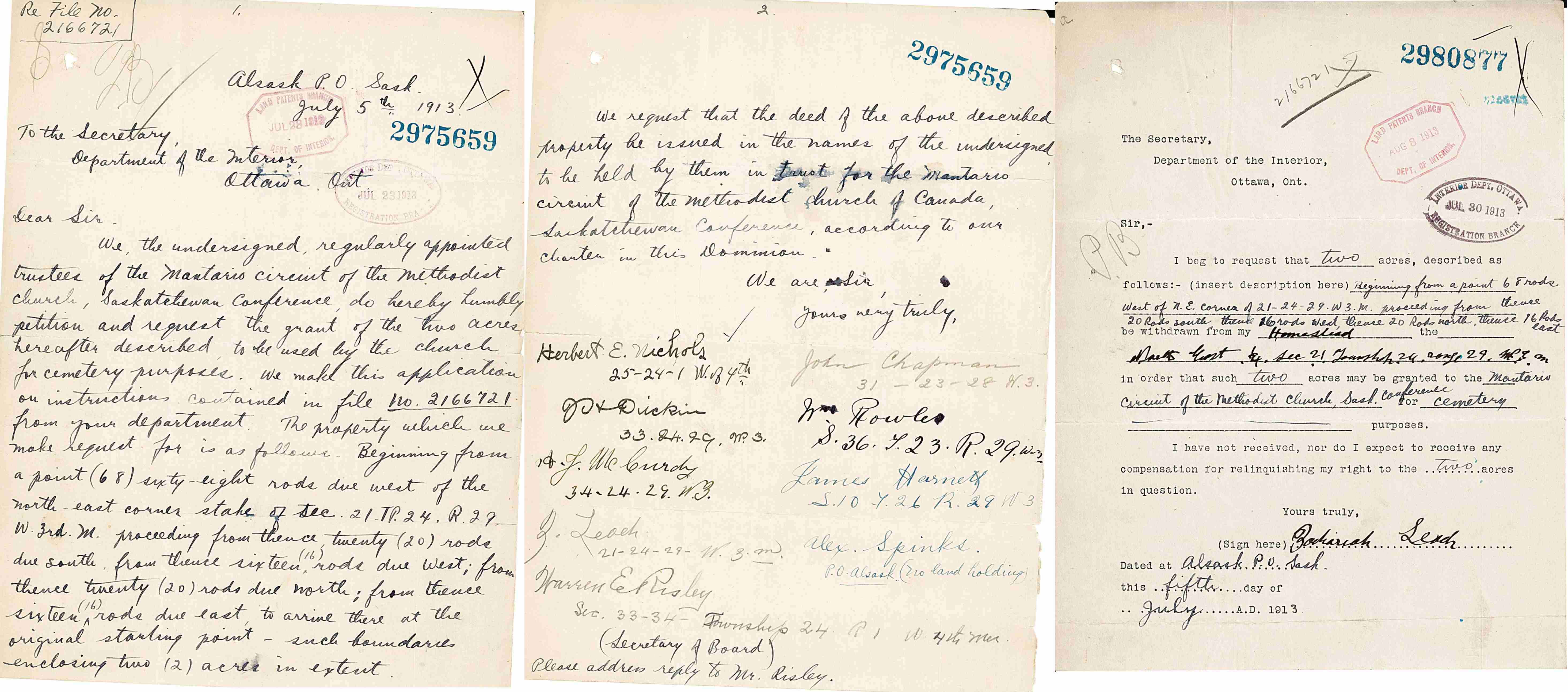 The Board of Trustees of the Mantario circuit of the Methodist Church, Saskatchewan Conference, wrote to the Department of the Interior requesting the grant of the two acres to be used by the church for cemetery purposes. Described as: Beginning from a point (68) sixty-eight rods due west of the north-east corner stake of sec. 21 TP. 24. R.29. W.3rd.M. proceeding from thence, twenty (20) rods due south, from thence sixteen (16) rods due west; from thence twenty (20) rods due north; from thence sixteen (16) rods due east to arrive there at the original starting point - such boundaries enclosing two (2) acres in extent.