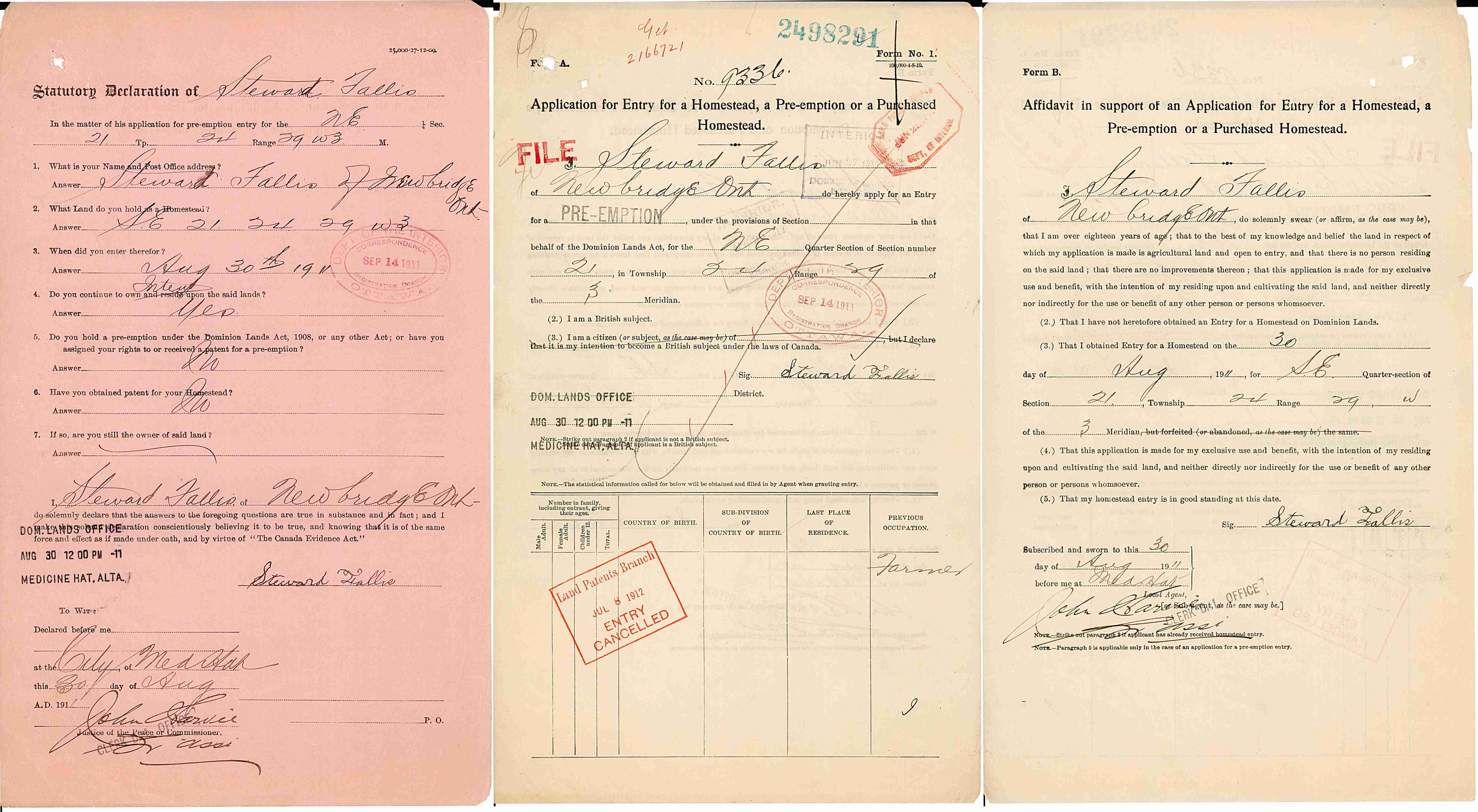Steward Fallis of Newbridge, Ontario applied for Entry for a Pre-emption for the quarter-section, on the basis that he was simultaneously obtaining Homestead Entry for the southeast quarter-section (SE-21-24-29-W3). There is no other paperwork with his name, but the application was stamped as Entry Cancelled, 1912-Jul-08 . |