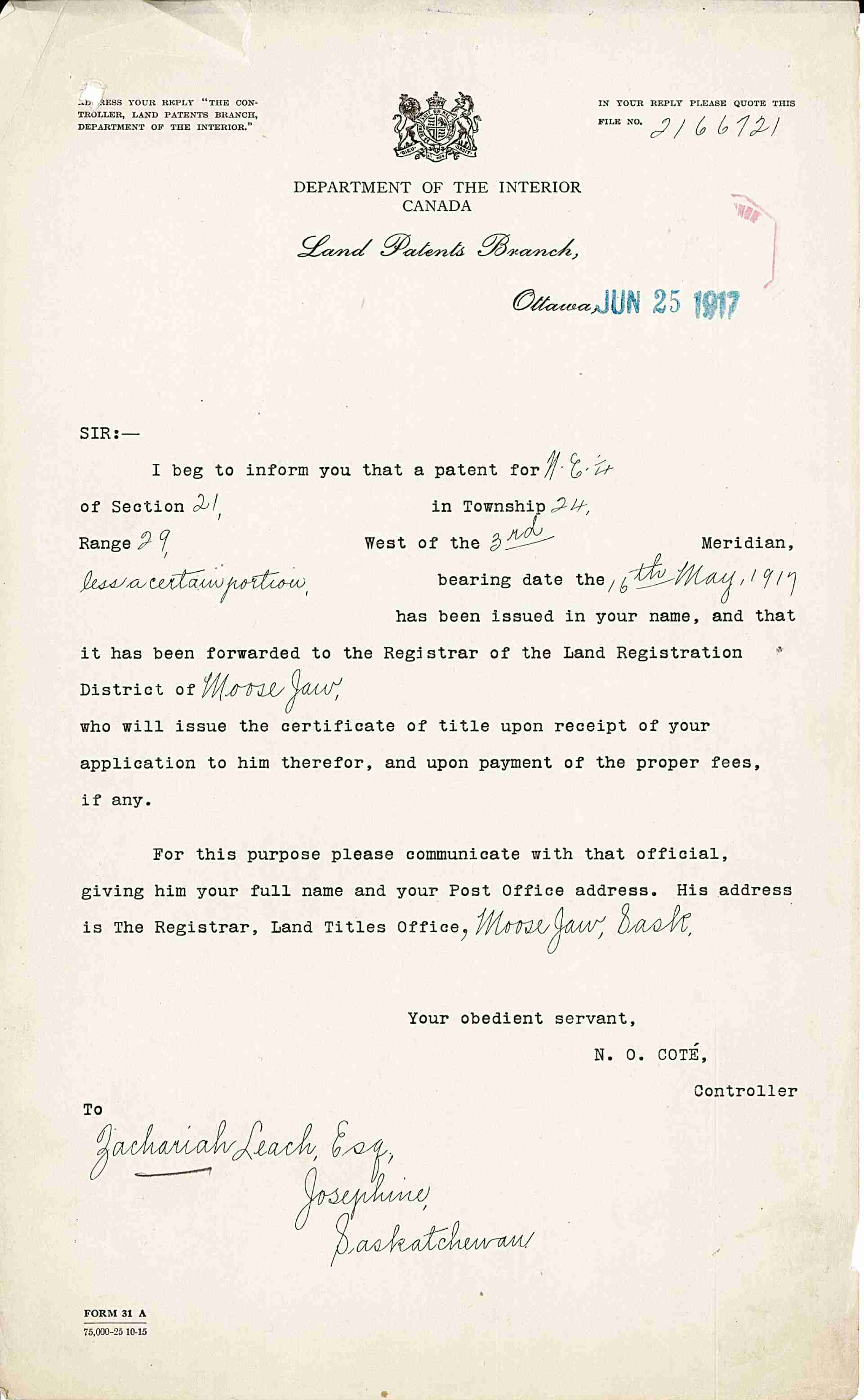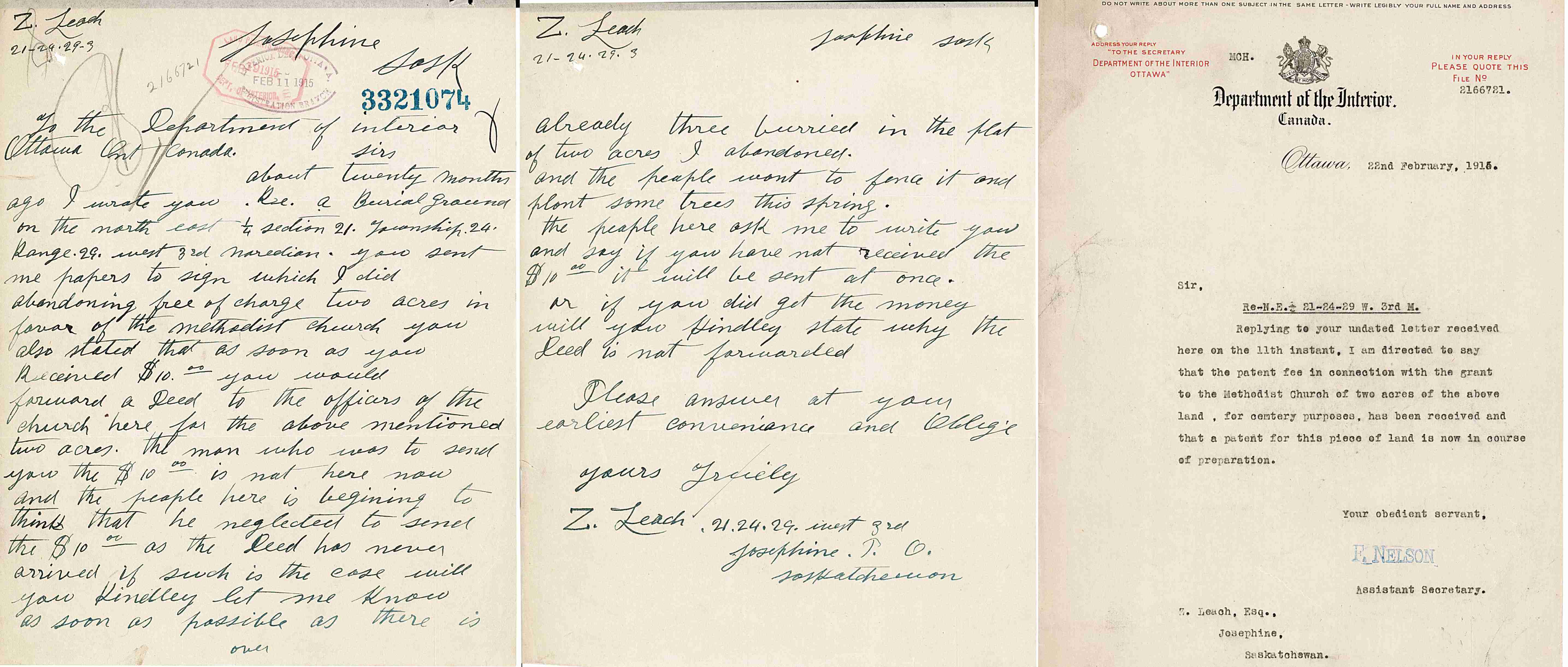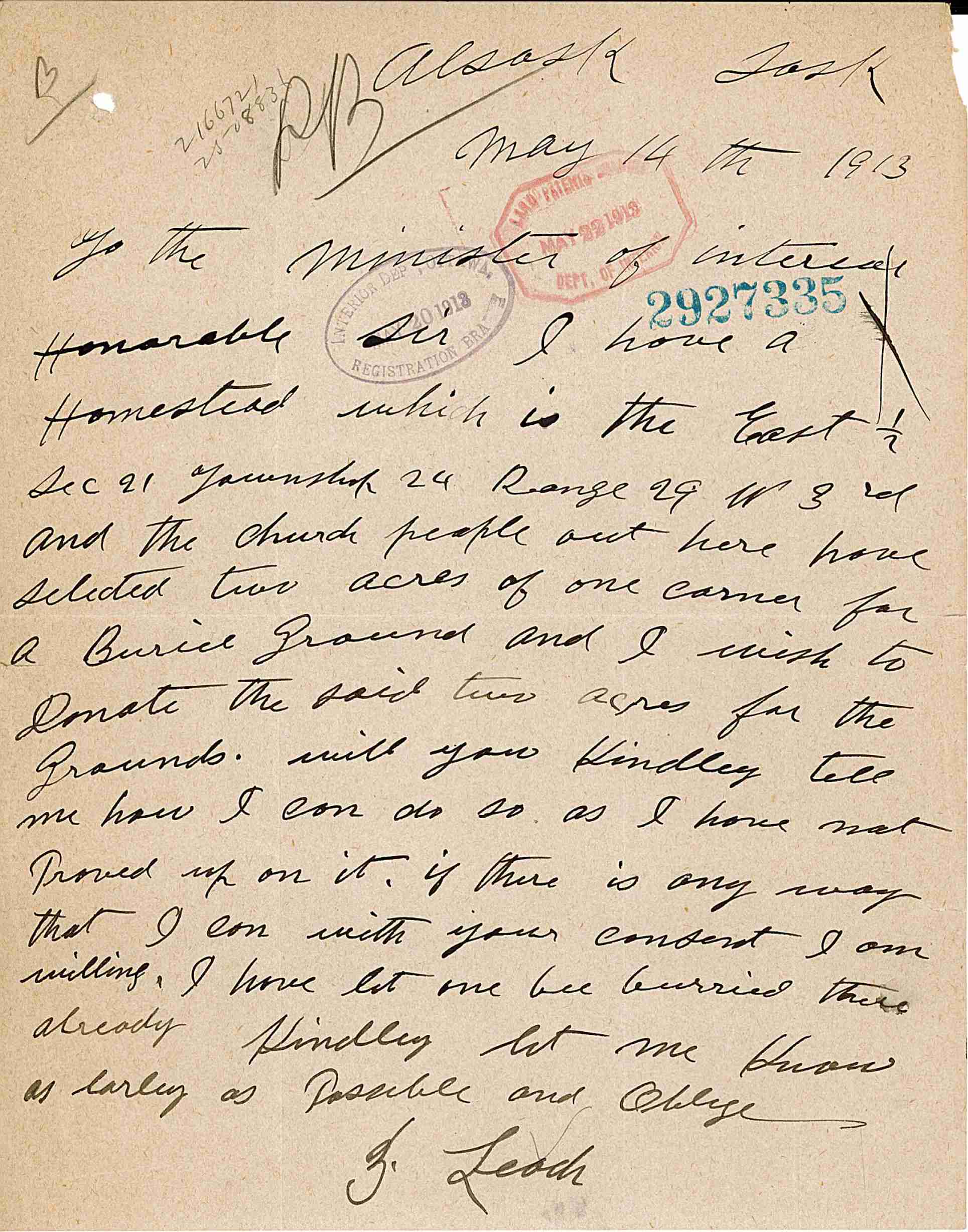 Zachariah Leach wrote to the Department of Interior saying he has a homestead that is the E½-21-24-29-W3, and he wants to donate two acres for a burial ground. He asks how to do that, since he has not proved up the homestead yet. They reply saying how. |