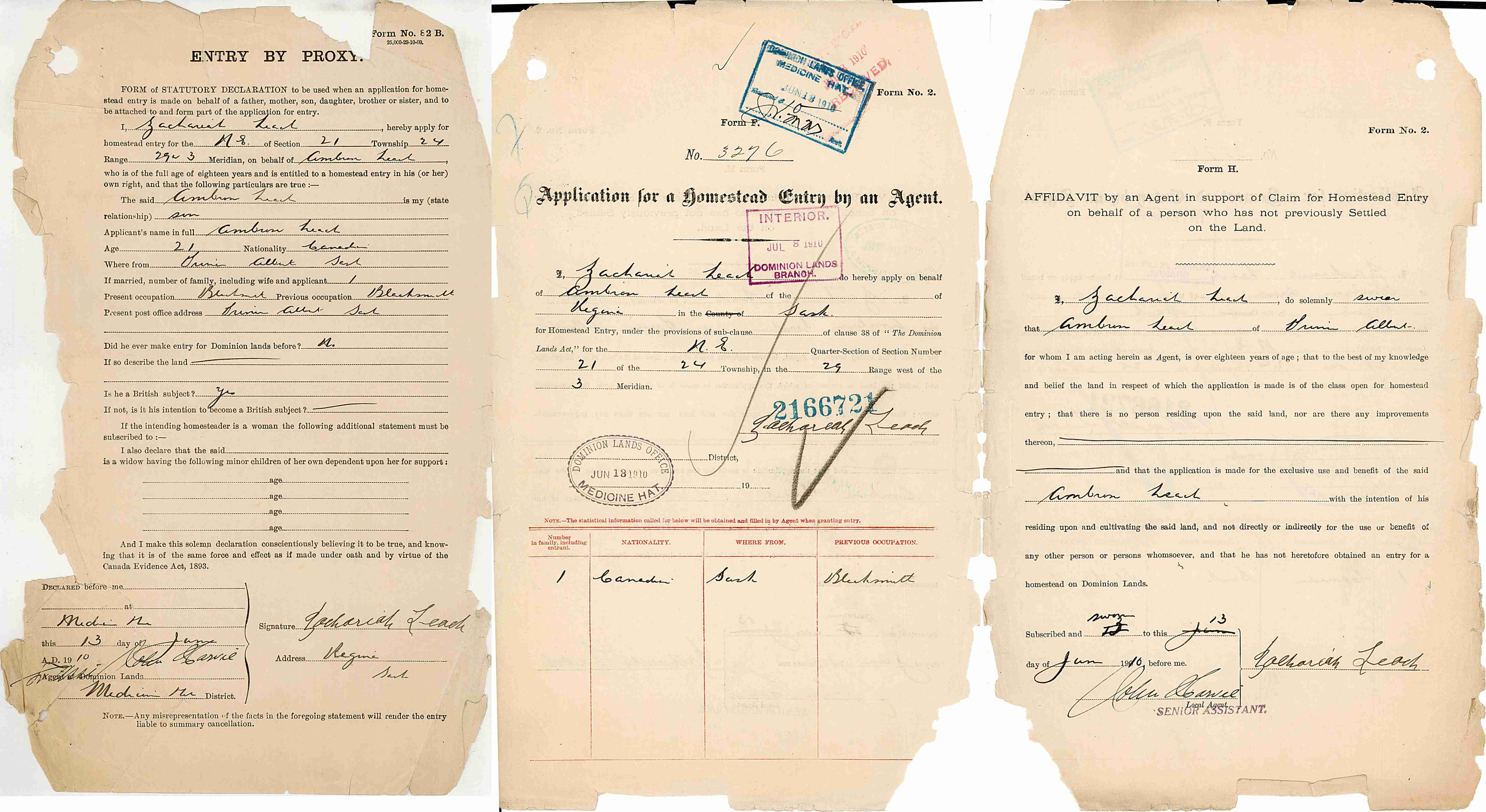 Zachariah Leach applied for Homestead Entry as a proxy for his son Ambrose Leach, who was 21 years old, single, a blacksmith, with post office address Prince Albert, Saskatchewan. |