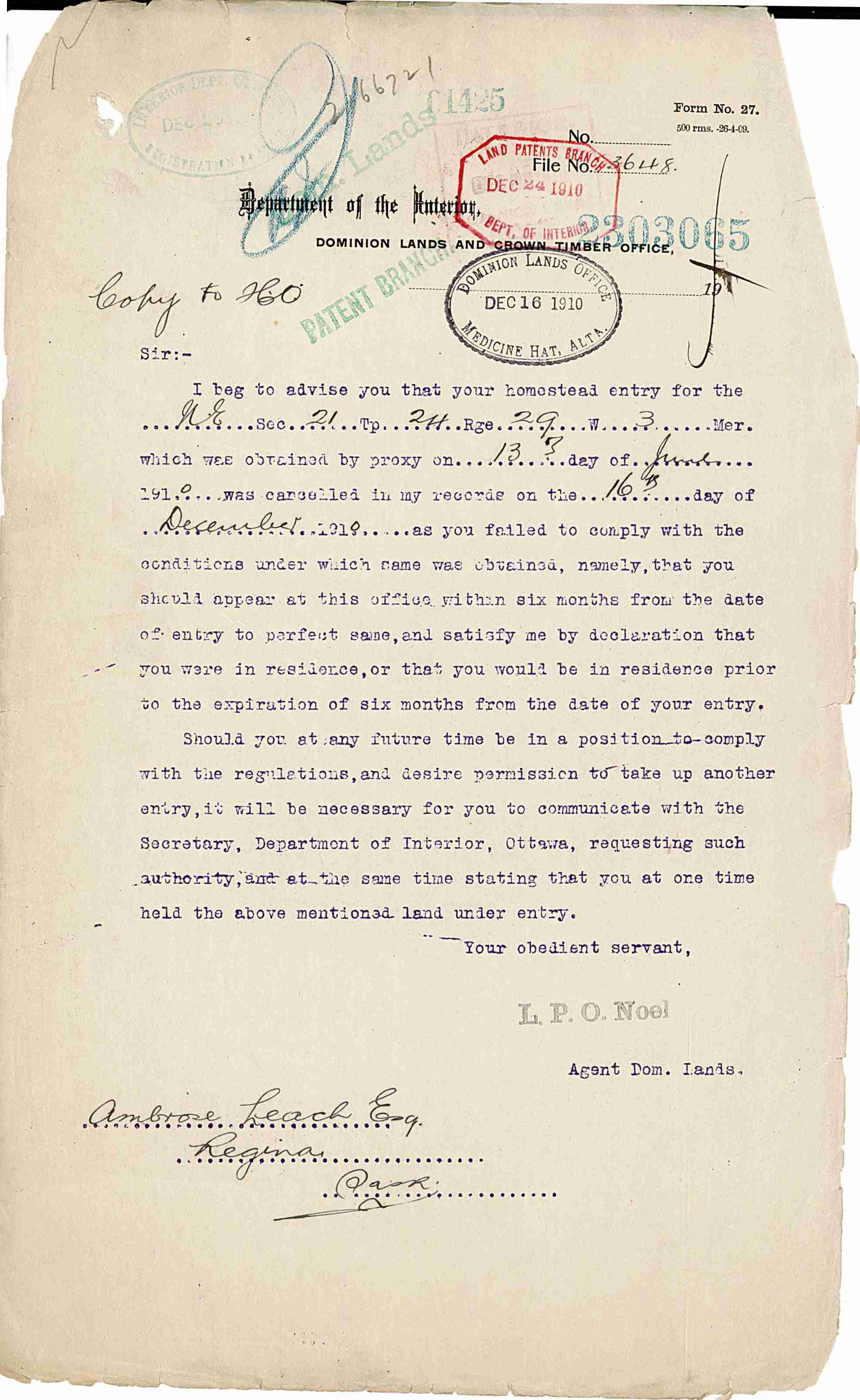 1911-Aug-30: Homestead Entry Application, then Cancelled