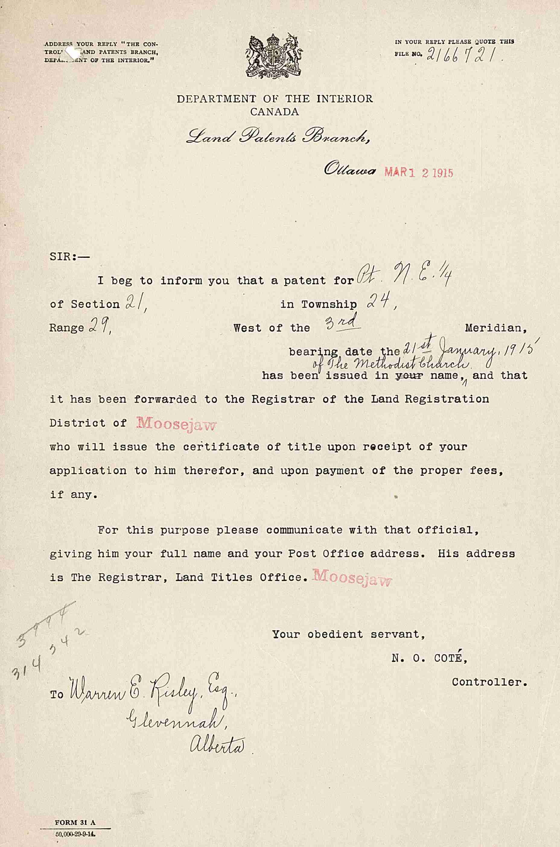 The Department of the Interior replied that they did receive the $10 and the patent for the land is in course of preparation. Actually, the patent had been granted a month prior, but the paperwork is slow in filing, probabably because of the World War. |