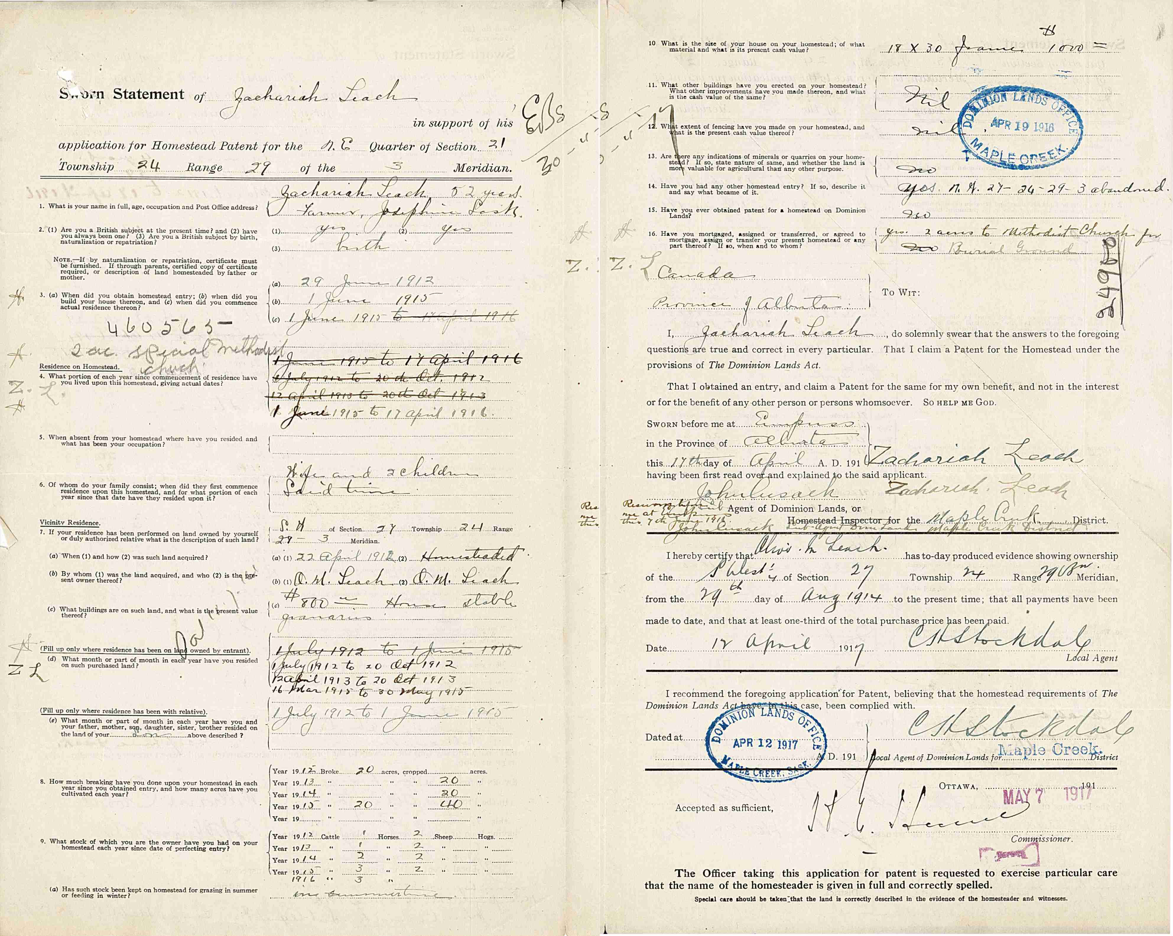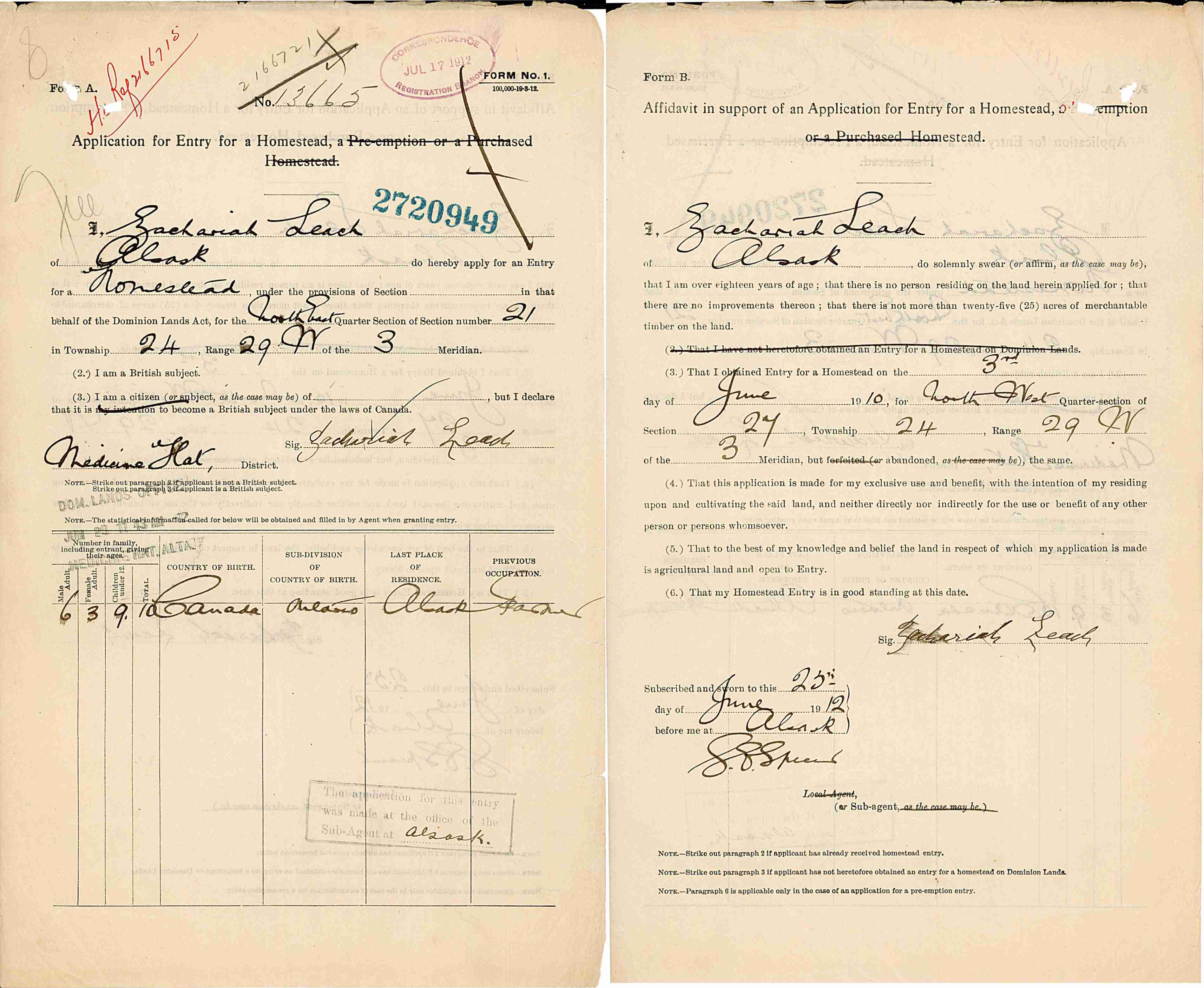 Zachariah Leach applied for Homestead Entry for himself. The family consisted of 6 adult males, 3 adult females, and 9 children under the age of 12. He stated that he had previously obtained Homestead Entry on 1910-Jun-03 for NW-27-24-29-W3. |